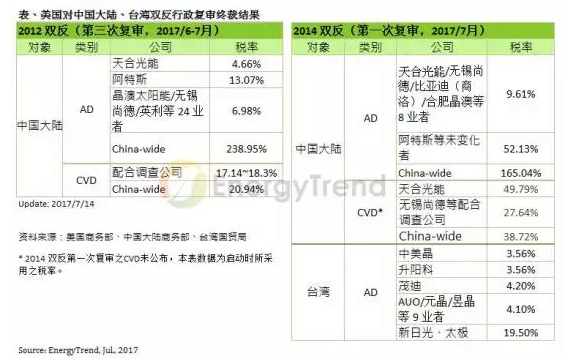 美國(guó)商務(wù)部最新發(fā)布對(duì)中國(guó)大陸與臺(tái)灣光伏電池與組件的雙反行政復(fù)審。集邦咨詢新能源研究中心(EnergyTrend)分析本次復(fù)審終裁結(jié)果,稅率均較原先版本下降,雖然之前在第三地產(chǎn)能大開的情況下,美國(guó)的雙反稅率已無作用,但今年受到201事件影響,大量急單需求涌現(xiàn),造成第三地產(chǎn)能不足、價(jià)格上漲,大量歐美訂單尋求其他產(chǎn)地,雙反稅率在第三季重要性大增。