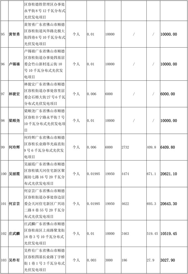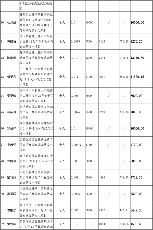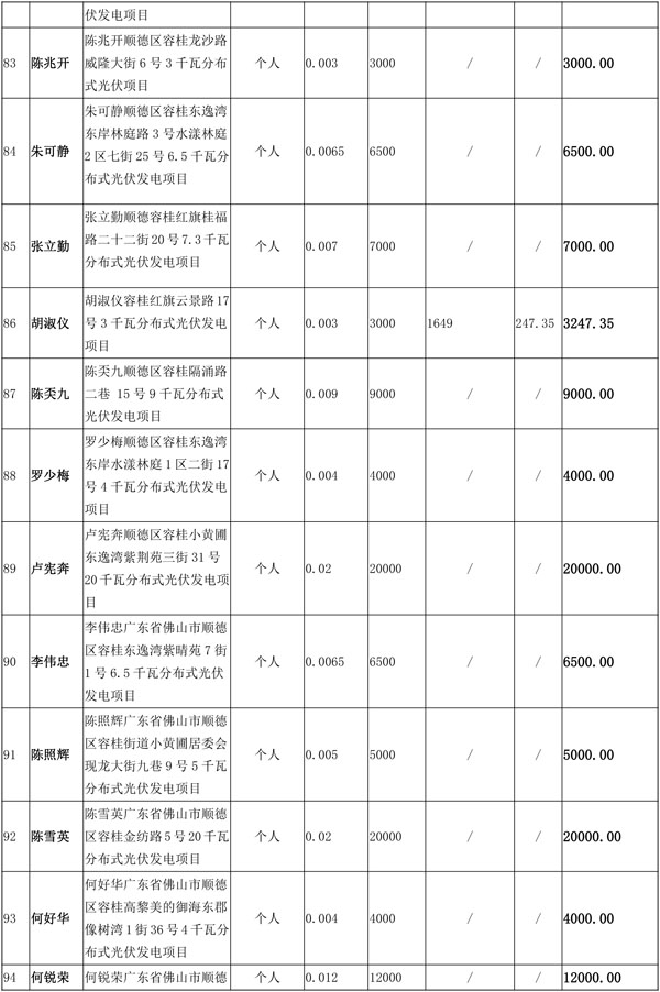 佛山市順德區(qū)光伏發(fā)電應用項目獎勵和補助資金匯總表(2016年度)