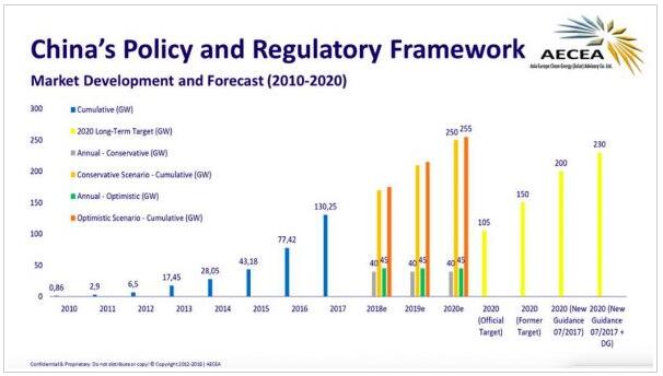 而官方對于2020年的累計裝機目標(biāo)也幾經(jīng)上調(diào),從最初的105GW到目前的230GW;而業(yè)內(nèi)專家預(yù)計中國到2020年裝機可達(dá)250-255GW。