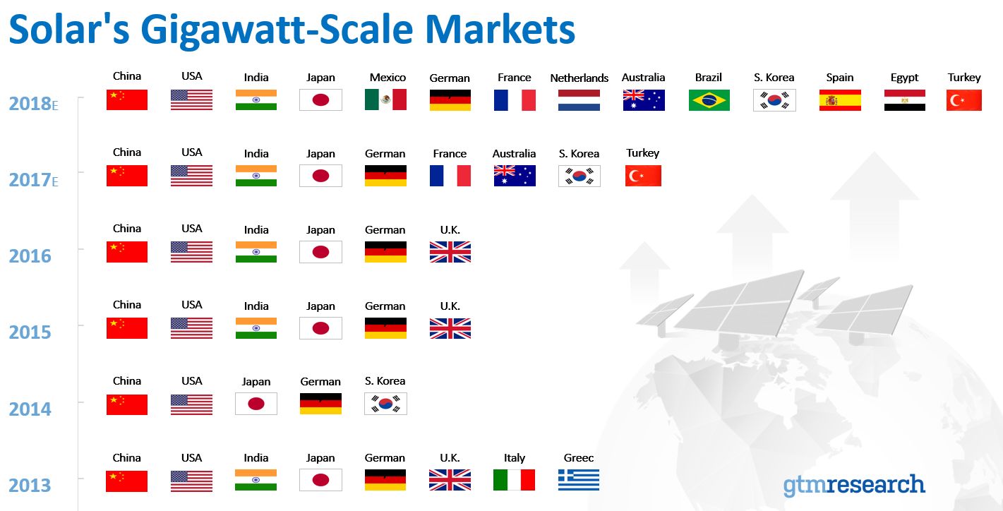 巴西,埃及,墨西哥,荷蘭和西班牙等國家在2018年首次跨越1千兆瓦的年度門檻。