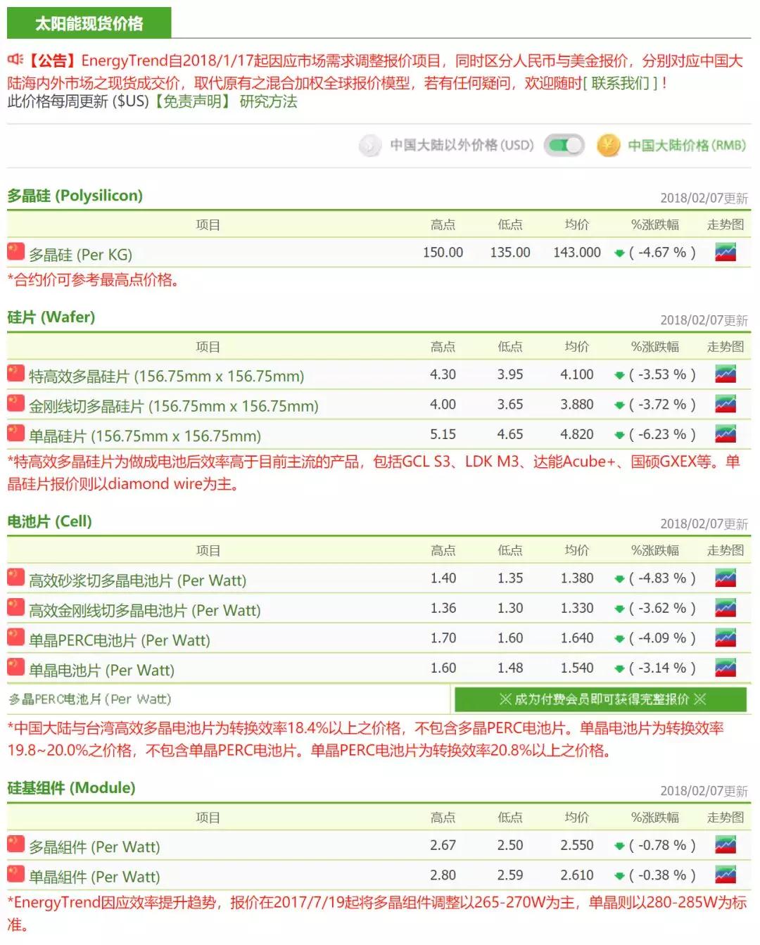 由于前兩周硅片價格的跌速過快,使得下游的電池片廠商不敢貿(mào)然放量采購;加上廠商對年后需求不太確定,因此成交狀況也是偏弱。本周單晶硅片價格在RMB4.65-5.1/pc、USD0.65-0.71/pc,多晶硅片價格則在RMB3.7-4/pc、USD0.54-0.56/pc。