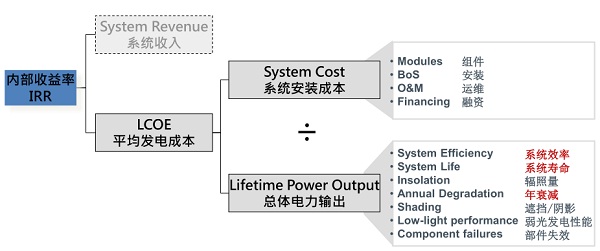 鑒于每瓦成本的局限性,業(yè)內(nèi)專家開始倡導(dǎo)以度電成本(LCOE)來衡量光伏系統(tǒng)的性能和收益。度電成本(LCOE)提供了更準(zhǔn)確的成本和現(xiàn)金流計算方式,能反映出真實的系統(tǒng)效能,并準(zhǔn)確評估光伏電站的投資回報,能夠幫助電站投資者更加明智的測算系統(tǒng)性價比和收益。