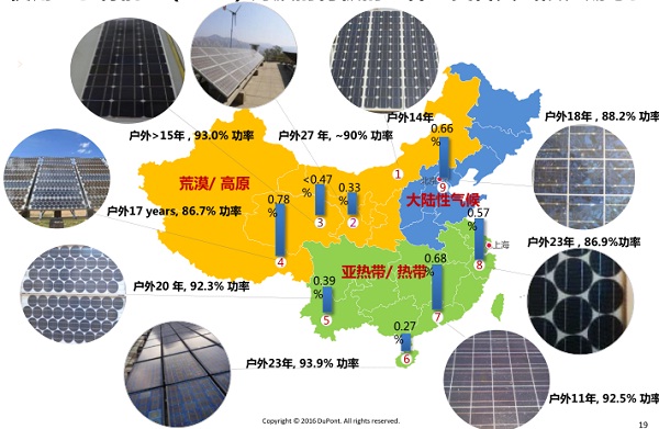 在2011年,杜邦啟動一項全球性的光伏組件研究,涵蓋了不同地區(qū)及氣候范圍。研究重點為光伏電站組件的可靠性與其它影響組件完整性的因素。至2015年底,杜邦戶外組件檢測研究已經(jīng)在北美、歐洲和亞洲檢驗了超過60個光伏項目,包括了安裝時間0-30年的光伏項目,涵蓋了超過45家組件制造商的產(chǎn)品。以下是該項研究的一些結(jié)果分析。