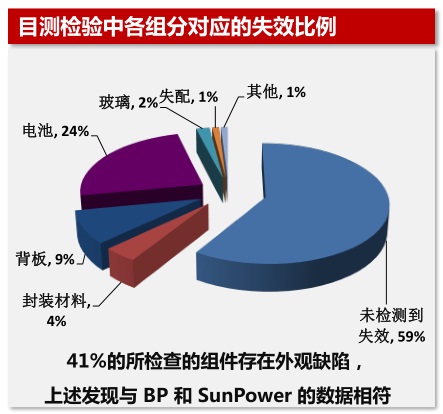 從檢測結(jié)果來看,未檢測到外觀失效的組件比例占到了59%,也就意味著還有41%的組件是存在一定外觀失效問題的。這其中電池所占的比率是24%,其次是背板,占到了9%。光伏組件中,電池和背板是最重要的兩個影響因素。