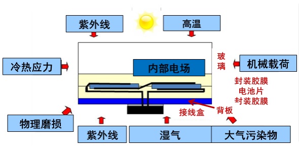 而作為組件來說,它的封裝系統(tǒng)需要為其提供絕緣保護(hù),組件自身需要耐受各種外部環(huán)境應(yīng)力長期化學(xué)和物理老化,而且組件內(nèi)部電池片和電路材料還需要耐受機(jī)械應(yīng)力以及內(nèi)部電場和遷移到組件內(nèi)部濕氣、氧氣、離子共同作用的電化學(xué)腐蝕。
