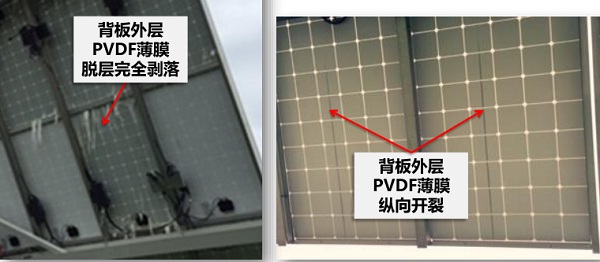 該案例是位于北美的4個地面光伏系統(tǒng),2011年安裝,戶外運行4年。該背板外層PVDF薄膜發(fā)生縱向開裂,嚴(yán)重的已經(jīng)剝落;其4個系統(tǒng)中PVDF背板發(fā)生該失效比例達(dá)到21%~85%。