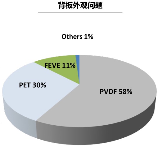 從背板外觀失效的組件中,按材料類型來分類,其中PVDF材料失效所占比例最高,達(dá)到58%,接下來是PET與FEVE,分別占到了30%和11%。