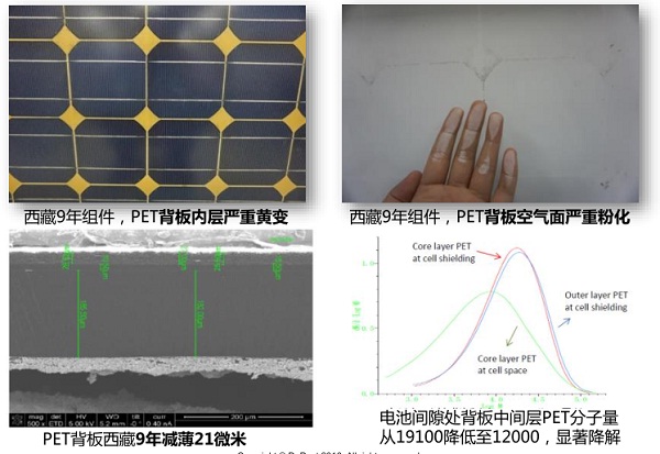 該案例是位于西藏的一個光伏電站,組件使用了9年,背板從內(nèi)層看有非常嚴(yán)重的黃變,而且PET背板空氣面嚴(yán)重粉化剝落,厚度衰減嚴(yán)重,9年減薄了21微米;并且,電池間隙處背板中間層PET分子量從19100降低至12000,發(fā)生了顯著降解。