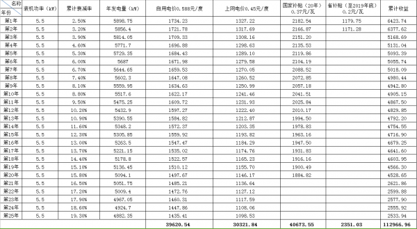 裝機(jī)容量5.5kW,首年發(fā)電量為5898.75kwh。首年衰減為2.5%,25年末最低功率為80%。