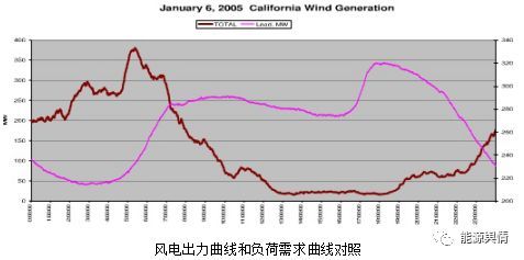 風電具有波動性的,從一年中風電場每天平均輸出功率看,每天最大和最少發(fā)電量至少相差約40~50倍。從微觀上分析一天內(nèi)的輸出功率變化,風電在24小時內(nèi)仍處于非常不穩(wěn)定狀態(tài),輸出功率(兆瓦)在0~100之間隨機波動。且夜晚用電負荷處于低谷時段風電發(fā)電出力往往較大,即使常規(guī)電源降出力,當風電規(guī)模達到一定程度(大于低谷用電負荷),難免出現(xiàn)限電棄風。下圖為風電出力曲線和負荷需求曲線對照。