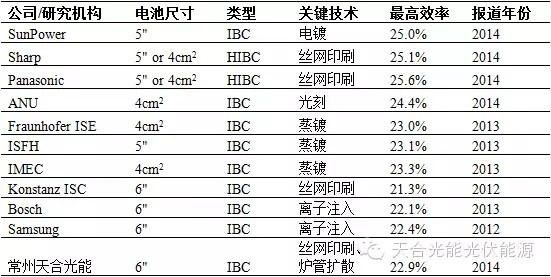 在IBC結構上,SunPower公司的研發(fā)遙遙領先,其它研究成果如德國FraunhoferISE的23%,ISFH的23.1%,IMEC的23.3%等等。最近,日本的研發(fā)人員將IBC與異質結(HJ)技術相結合,在2014年將晶體硅電池的效率突破到25%以上。其中日本Sharp和Panasonic公司將IBC與HJ技術結合在一起,研發(fā)的晶硅多結電池效率分別達到25.1%和25.6%。