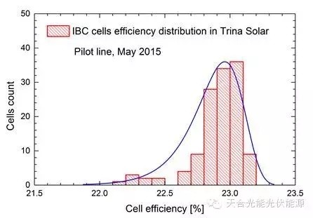 同年,由常州天合光能光伏科學與技術國家重點實驗室獨立研發(fā)的6英寸大面積IBC電池效率已達22.9%,成為了6英寸IBC電池的最高轉換效率。同時,天合光能依托國家863項目建成中試生產線,進入2015年后,天合光能科研人員采用最新開發(fā)的工藝,在中試生產線做出了平均22.8%,最高23.15%(內部測試)的結果,大部分電池效率在22%以上,如圖1所示,達到了目前工業(yè)級6英寸晶體硅電池效率的最高水平(SunPower電池均為5英寸)。