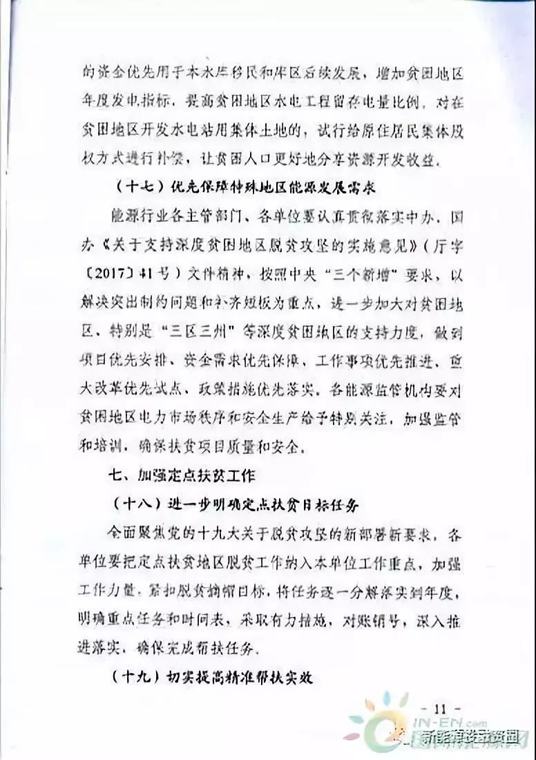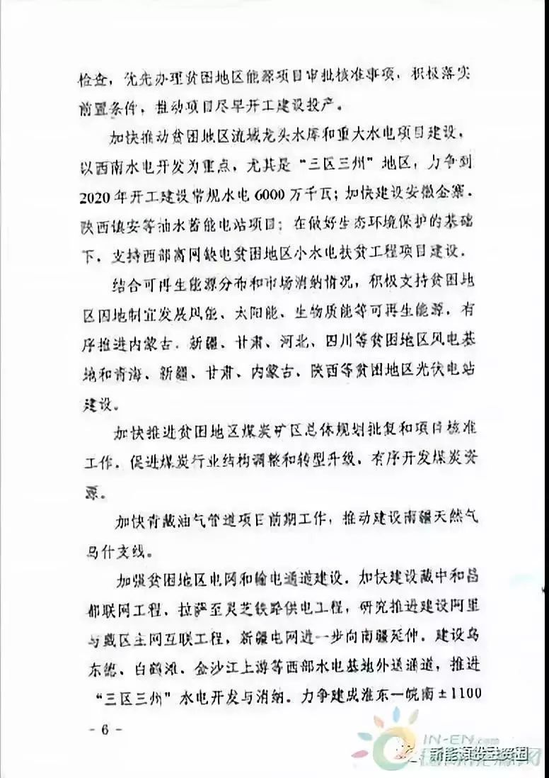 通知指出要加快貧困地區(qū)能源資源開發(fā)建設,優(yōu)先布局能源開發(fā)項目。在符合相關和政策、條件允許、經(jīng)濟可行的情況下,煤炭、煤電、油氣、水電等資源開發(fā)利用類重大項目,跨區(qū)域重大能源輸送通道項目以及風電、光伏等新能源項目,優(yōu)先在貧困地區(qū)布局建設,加快推進涉及貧困地區(qū)的各類能源規(guī)劃編制、審核、批復工作。以西南水電開發(fā)為重點,有序推進內(nèi)蒙古、新疆、甘肅、河北、四川等貧困地區(qū)風電基地和青海、新疆、甘肅、內(nèi)蒙古、陜西等地區(qū)光伏電站建設;加快青藏油氣管道項目E前期工作;加快推進煤炭礦區(qū)總體規(guī)劃批復和項目核準工作,促進煤炭行業(yè)結構調(diào)整和轉型升級;同時加強貧困地區(qū)電網(wǎng)和書店通道建設,加快建設藏中和昌都聯(lián)網(wǎng)工程、拉薩至靈芝鐵路供電工程等。