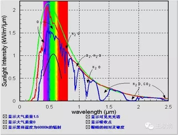 1、太陽光譜和能量分布圖是基于黑體輻射理論所得,AM1.5和大氣層外光譜圖的差別是因?yàn)榇髿鈱又械臍怏w和塵埃吸收及散射、反射等所致。