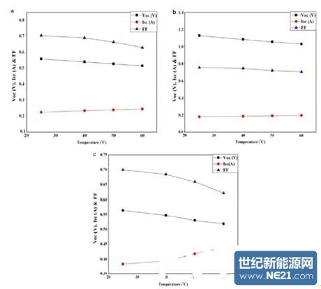 圖5.單個、串、并聯(lián)單晶硅太陽能電池Voc、Isc、FF隨溫度變化曲線。
