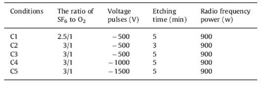 156mm,P型摻雜,厚度為200±20μm,電阻率1-3Ω。首先在80℃下,濃度為10%的NaOH溶液中去除硅片表面機(jī)械損傷。隨后采用不同條件(如表1)的PIII方法制絨。然后所有的硅片在2%的HCl和10%的HF中去除金屬離子、雜質(zhì)、氧化層。在825℃條件下,使用POCl3擴(kuò)散。然后邊緣刻蝕,在體積分?jǐn)?shù)10%的HF溶液中去除磷硅玻璃。采用等離子體增強(qiáng)化學(xué)氣相沉積法 (PECVD)沉積的SiNx厚度為80nm、折射率為2.05。最后絲網(wǎng)印刷、燒結(jié)制備成電池。