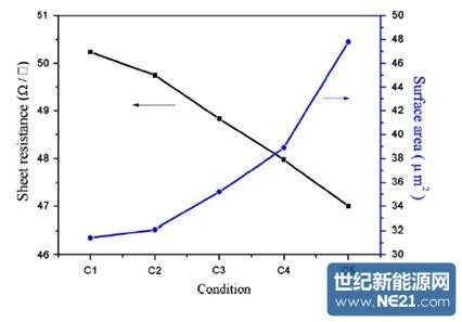 圖4.不同條件的方阻和表面面積。