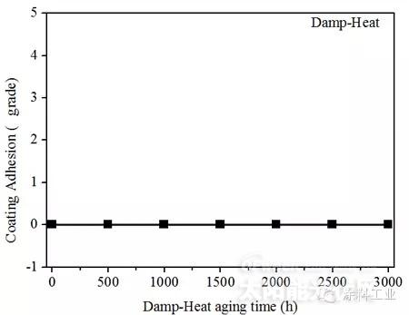 圖3所示為涂覆型背板BEC-301結(jié)構(gòu)示意圖,背板由F-coating/PET/F-coating三層結(jié)構(gòu)組成。PET經(jīng)雙向拉伸后具有很高的結(jié)晶性,表面張力低、極性弱,需通過等離子處理或電暈處理,以提高其表面極性,使其表面產(chǎn)生可以反應(yīng)的功能基團(tuán)(如OH、COOH等)。這些功能基團(tuán)能夠與涂層中的固化劑發(fā)生化學(xué)反應(yīng),使得氟樹脂與PET間產(chǎn)生穩(wěn)定的化學(xué)橋聯(lián)結(jié)構(gòu),從而形成涂層與PET間三層化學(xué)鍵接的一體化結(jié)構(gòu)。這種穩(wěn)定的化學(xué)結(jié)合方式使涂覆型背板充分克服了TPT/KPK/TPE/KPE等氟膜型背板易層間易分層的缺點(diǎn),賦予BEC-301背板優(yōu)秀的層間粘結(jié)特性。如圖4所示,經(jīng)長(zhǎng)期濕熱老化(85℃,85RH%)后,涂層的附著力一直保持在0級(jí)水平,不會(huì)出現(xiàn)隨老化時(shí)間的延長(zhǎng),涂層脫落的現(xiàn)象。從而,表明了涂層與PET間化學(xué)鍵接作用的穩(wěn)定性和長(zhǎng)效性。