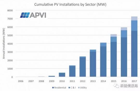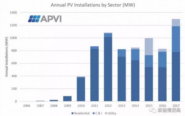 從2012-2016,澳大利亞的戶用裝機(jī)量一直在下滑,但是在2017年卻增長了44%,由541MW增加到了779MW。