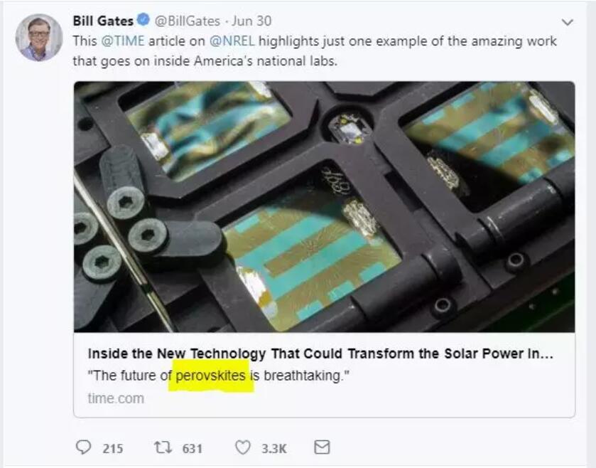 6月30日,比爾蓋茨親自在自己的Twitter帳號上轉(zhuǎn)發(fā)了《時代》雜志的文章,里面介紹了鈣鈦礦太陽能技術(shù)的一些進展。