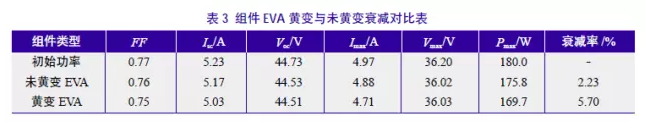 在該電站上分別選取一塊EVA黃變組件和一塊EVA未黃變組件,分別測(cè)試其功率,數(shù)據(jù)見表3。
