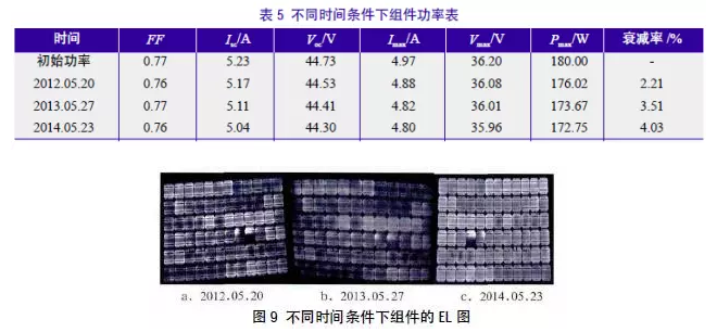 本文重點(diǎn)對(duì)組件初始功率衰減和材料老化功率衰減兩種現(xiàn)象進(jìn)行分析研究,同時(shí)對(duì)某研究所電站進(jìn)行現(xiàn)場(chǎng)跟蹤測(cè)試分析,得出以下結(jié)論: