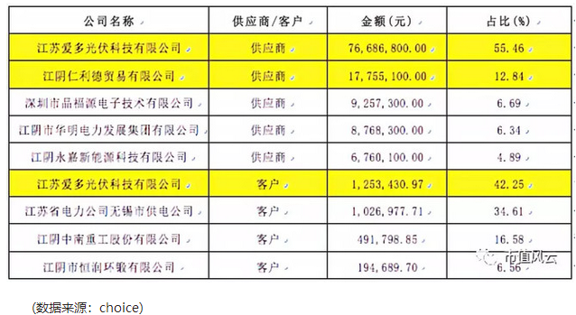 2015年的前五大供應(yīng)商及客戶中,江蘇愛多光伏科技有限公司即是江蘇鼎陽第二大供應(yīng)商也是第三大客戶;江陰仁利德貿(mào)易有限公司則為第一大供應(yīng)商。