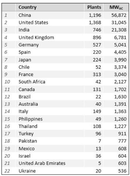 總體而言,太陽(yáng)能園區(qū)的累計(jì)容量已達(dá)到約160吉瓦,其中大部分部署在中國(guó)(56.8吉瓦),美國(guó)(31.0吉瓦),印度(21.3吉瓦),英國(guó)(6.7吉瓦)和德國(guó)(5吉瓦)。