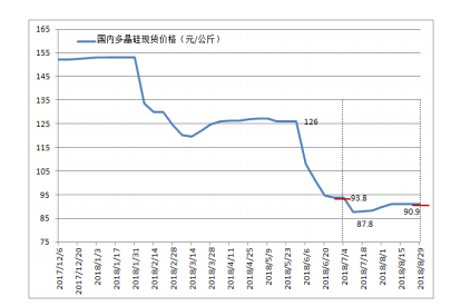 2018年7-8月份多晶硅價(jià)格觸底后緩慢回彈,7月初太陽(yáng)能一級(jí)致密料成交價(jià)9.38萬(wàn)元/噸,第二周觸底到階段性低點(diǎn)8.78萬(wàn)元/噸,從第三周開(kāi)始緩慢回升,每周漲幅都僅在1%左右,價(jià)格回升到8月初的9.09萬(wàn)元/噸后維持不變。