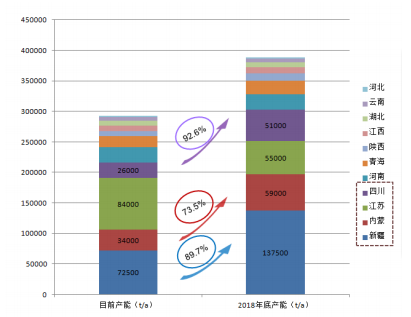 目前中國(guó)多晶硅產(chǎn)能主要集中在新疆、內(nèi)蒙、江蘇、四川等地區(qū),產(chǎn)能集中度達(dá)到73.6%,隨著產(chǎn)能逐漸向資源優(yōu)勢(shì)地區(qū)轉(zhuǎn)移,到2018年底,新疆、內(nèi)蒙地區(qū)多晶硅產(chǎn)能相較2017年底分別將有89.7%和73.5%的提升。四川因水電系清潔能源的優(yōu)勢(shì),產(chǎn)能也有92.6%的提升。