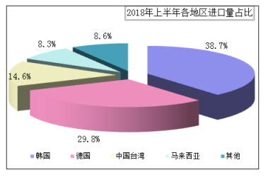 分國(guó)別來(lái)看:2018年上半年,自韓、德、臺(tái)、馬這四個(gè)地區(qū)進(jìn)口量63166噸,占總進(jìn)口量的91.4%,進(jìn)口量占比分別為38.7%、29.8%、14.6%、8.3%,韓國(guó)進(jìn)口量仍居首位。