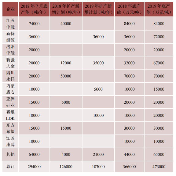 根據(jù)國(guó)內(nèi)各多晶硅企業(yè)原規(guī)劃,2018年下半年產(chǎn)能增量在17.5萬(wàn)噸/年左右,到2018年底,國(guó)內(nèi)多晶硅產(chǎn)能可達(dá)43.9萬(wàn)噸/年,但根據(jù)實(shí)際運(yùn)行情況評(píng)估,部分增量將暫緩或者終止,下半年實(shí)際新增量大約在12.6萬(wàn)噸/年左右,包括:新疆協(xié)鑫4萬(wàn)噸/年(分兩條線,分別在9月和10月份進(jìn)料,量產(chǎn)在10-11月份)、內(nèi)蒙通威2.5萬(wàn)噸/年、四川通威2.5萬(wàn)噸/年(通威內(nèi)蒙和四川兩個(gè)多晶硅項(xiàng)目分別將在9月份和10月份投產(chǎn))、新疆大全1.2萬(wàn)噸/年(9月底投產(chǎn))、東方希望1.5萬(wàn)噸/年(7月份已經(jīng)逐步開(kāi)始啟動(dòng))、亞洲硅業(yè)5000噸/年(9月份投產(chǎn),10月份釋放)等,加之另有七家企業(yè)5.4萬(wàn)噸/年現(xiàn)有產(chǎn)能暫無(wú)明確復(fù)產(chǎn)計(jì)劃,預(yù)計(jì)2018年底國(guó)內(nèi)多晶硅總產(chǎn)能在36.6萬(wàn)噸/年左右,同比凈增9萬(wàn)噸/年。2019年新增量主要集中在新特能源3.6萬(wàn)噸/年、大全3.5萬(wàn)噸/年、天宏瑞科1.0萬(wàn)噸/年(規(guī)劃產(chǎn)能釋放)等,到2019年底預(yù)計(jì)產(chǎn)能將達(dá)到47.3萬(wàn)噸/年。