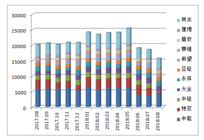 硅業(yè)分會(huì)統(tǒng)計(jì),截止2018年8月底,國(guó)內(nèi)多晶硅產(chǎn)能共計(jì)29.4萬(wàn)噸/年,其中在產(chǎn)企業(yè)16家(包括分線檢修企業(yè)),在產(chǎn)產(chǎn)能21.5萬(wàn)噸/年,停產(chǎn)檢修產(chǎn)能7.9萬(wàn)噸/年,其中停產(chǎn)暫無(wú)復(fù)產(chǎn)計(jì)劃產(chǎn)能約5.4萬(wàn)噸/年,占總產(chǎn)能的18.4%。1-8月份國(guó)內(nèi)多晶硅產(chǎn)量共計(jì)17.48萬(wàn)噸,其中1-5月份國(guó)內(nèi)多晶硅月均產(chǎn)量在2.43萬(wàn)噸,從6月份開(kāi)始大幅下降到1.91萬(wàn)噸,環(huán)比驟減25.1%,7月份國(guó)內(nèi)多晶硅產(chǎn)量降至1.86萬(wàn)噸,環(huán)比減少2.62%,8月份產(chǎn)量大幅減少至1.57萬(wàn)噸,環(huán)比大幅減少15.6%。按產(chǎn)量排序,前七家企業(yè)8月份產(chǎn)量共計(jì)11540噸,占總產(chǎn)量的73.3%。本月產(chǎn)量在千噸以上的只有四家,分別為:江蘇中能、四川永祥、新疆大全、亞洲硅業(yè),四家產(chǎn)量在總產(chǎn)量中占比為57.4%。從6月份開(kāi)始國(guó)內(nèi)多晶硅供應(yīng)日漸縮減,主要是由于終端需求驟減,下游價(jià)格大幅下跌,倒逼硅料價(jià)格跌破大量多晶硅企業(yè)生產(chǎn)成本線,部分產(chǎn)能被迫停產(chǎn)檢修,檢修企業(yè)數(shù)量最高達(dá)到14家,截止8月底尚有九家企業(yè)仍在檢修,多晶硅供應(yīng)大幅縮減,有效緩解了本輪多晶硅價(jià)格的強(qiáng)勢(shì)下跌。