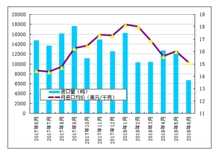 圖3 2017年6月-2018年6月多晶硅進(jìn)口量及進(jìn)口均價(jià)示意圖