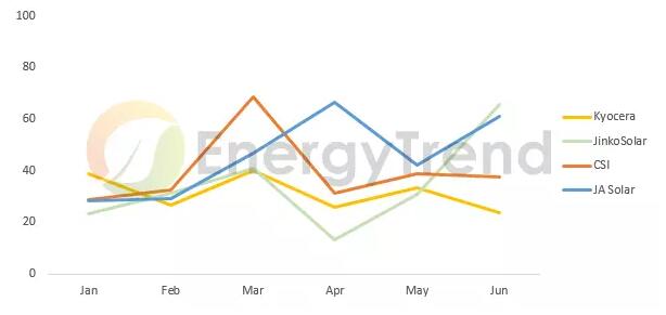 以中國出口日本的組件廠商來看,1H18出貨量最高的晶澳在日本市場呈現(xiàn)倒吃甘蔗的情形,出貨量從3月開始明顯增加。晶澳也是2Q18對日本出貨最多的中國廠商,在日本的累積出貨量達3.3GW。晶澳經(jīng)營日本等海外市場多年有成,不依賴單一市場,上半年整體出貨量達4GW。