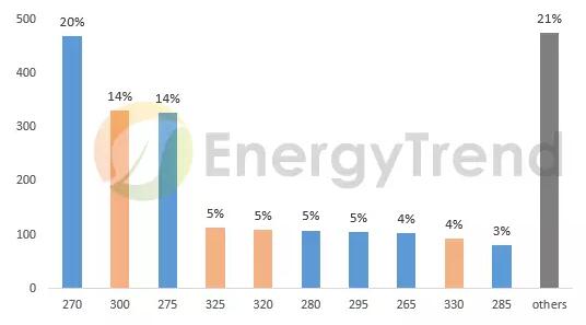 在進口產(chǎn)品方面,日本市場仍以300W以下的組件為主。1H18期間,270W組件占總出口量的20%。雖然270W~275W的一般多晶組件仍占主流地位,但300W以上的高效單晶組件在日本市場的接受度也慢慢提升,300W組件占總出貨量的14%排名第2,推測與市場需求風(fēng)向轉(zhuǎn)換有關(guān)。但整體來看,日本的組件產(chǎn)品需求仍是一個相對分散的市場,出貨量前10的組件產(chǎn)品類別之出口總量也僅占79%。