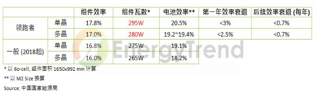 中國(guó)國(guó)家能源局發(fā)布了第三批光伏領(lǐng)跑者效率門檻,訂定單、多晶組件的轉(zhuǎn)換效率分別落在17.8%與17%。以現(xiàn)行產(chǎn)品來看,這意味著單、多晶PERC將較有競(jìng)爭(zhēng)力,而相對(duì)于性價(jià)比之間的競(jìng)爭(zhēng),PERC產(chǎn)線是否成熟到足以供應(yīng)領(lǐng)跑者專案所需,將成為單多晶業(yè)者搶攻第三批領(lǐng)跑者占有率的關(guān)鍵。