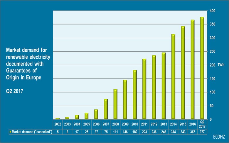 根據(jù)歐洲發(fā)行機構(gòu)協(xié)會的數(shù)據(jù),2017年二季度,歐洲綠色電力需求同比激增39%。
