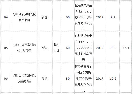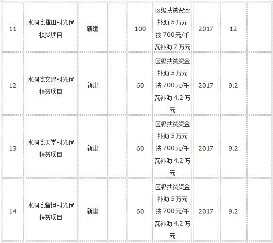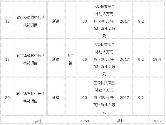 根據(jù)《關(guān)于開(kāi)展光伏產(chǎn)業(yè)扶貧工作的指導(dǎo)意見(jiàn)》(婁星政辦發(fā)〔2017〕7號(hào))和《關(guān)于全區(qū)易地扶貧搬遷和省級(jí)扶貧村光伏項(xiàng)目工作會(huì)議紀(jì)要》(婁星府閱〔2017〕10號(hào))精神,對(duì)光伏扶貧項(xiàng)目按區(qū)級(jí)700元/千瓦的補(bǔ)償資金列入當(dāng)年財(cái)政預(yù)算解決,另從區(qū)扶貧辦產(chǎn)業(yè)扶持中安排每個(gè)省級(jí)貧困村5萬(wàn)元。根據(jù)項(xiàng)目建設(shè)進(jìn)度,經(jīng)鄉(xiāng)鎮(zhèn)申請(qǐng),2017年我區(qū)建設(shè)20個(gè)省級(jí)貧困村1360千瓦撥付財(cái)政扶貧資金195.2萬(wàn)元予以公示,具體明細(xì)見(jiàn)附表。