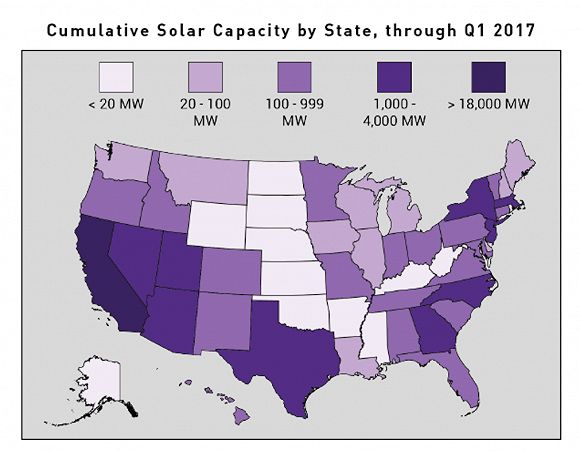 截至2017年第一季度,美國(guó)各州太陽(yáng)能發(fā)電力情況。圖片來(lái)源:美國(guó)太陽(yáng)能行業(yè)聯(lián)合會(huì)