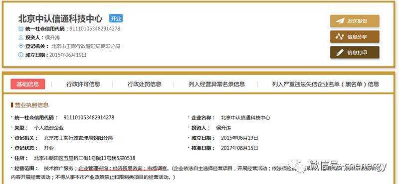 在“國家企業(yè)信用信息公示系統(tǒng)”的查詢結(jié)果中,北京中認(rèn)信通科技中心成立于2015年6月19日,并于今年8月15日剛剛通過了年度核準(zhǔn),注冊地址顯示為“北京市朝陽區(qū)五里橋二街1號院11號樓5層0518”,其經(jīng)營范圍包括技術(shù)推廣服務(wù)、企業(yè)管理咨詢、經(jīng)濟(jì)貿(mào)易咨詢和市場調(diào)查。
