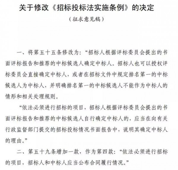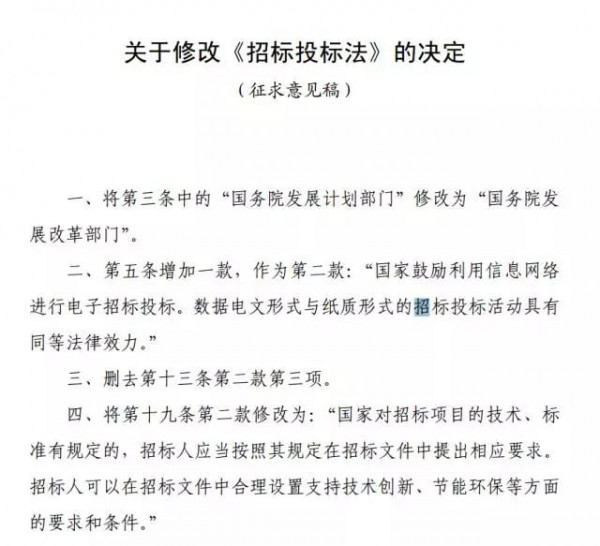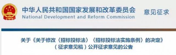 今(8月29日),國(guó)家發(fā)改委發(fā)布關(guān)于《關(guān)于修改〈招標(biāo)投標(biāo)法〉〈招標(biāo)投標(biāo)法實(shí)施條例〉的決定》(征求意見(jiàn)稿)公開(kāi)征求意見(jiàn)的公告。