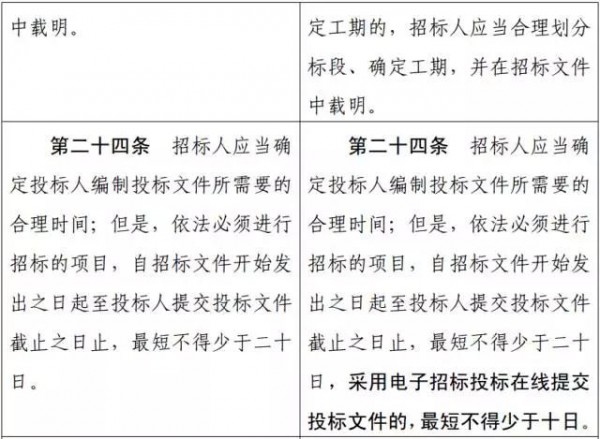 將第二十四條修改為:“招標(biāo)人應(yīng)當(dāng)確定投標(biāo)人編制投標(biāo) 文件所需要的合理時(shí)間;但是,依法必須進(jìn)行招標(biāo)的項(xiàng)目,自招標(biāo) 文件開(kāi)始發(fā)出之日起至投標(biāo)人提交投標(biāo)文件截止之日止,最短不得 少于二十日,采用電子招標(biāo)投標(biāo)在線提交投標(biāo)文件的,最短不得少 于十日。”