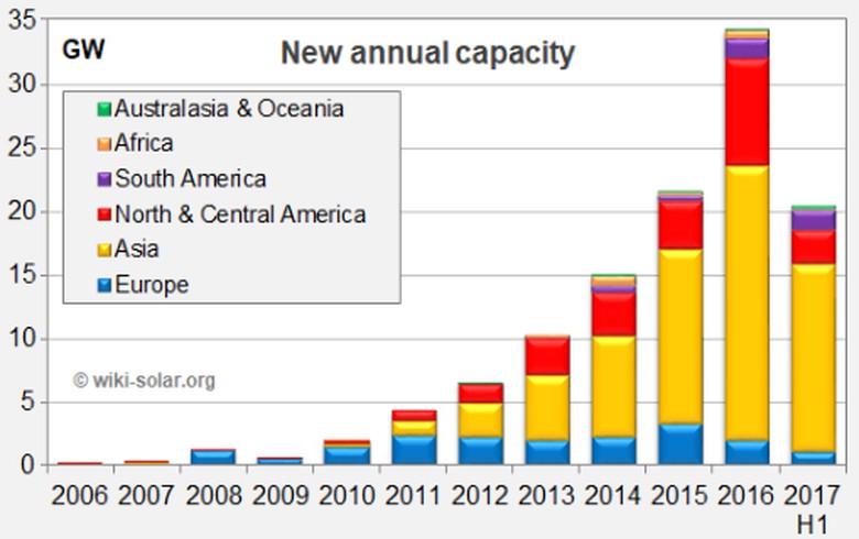 Wiki-Solar(維基百科-太陽能)發(fā)布的半年度數(shù)據(jù)顯示,公用事業(yè)規(guī)模太陽能容量部署繼續(xù)加速。今年上半年雖然僅20吉瓦公用事業(yè)規(guī)模太陽能并網(wǎng),但累計(jì)容量已超越2017年初不可思議的100吉瓦,達(dá)120吉瓦。上半年,亞洲