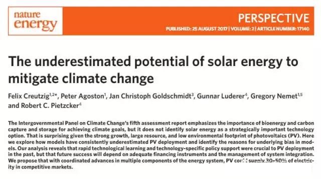 德國研究人員在最近一期《自然˙能源》雜志上發(fā)表題為“Theunderestimatedpotentialofsolarenergytomitigateclimatechange”(太陽能減緩氣候變化的潛力被低估)。在這篇文章中展示了下面的曲線圖: