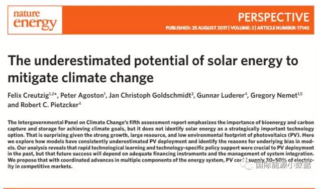 德國(guó)墨卡托研究所(Mercator Research Institute)的研究人員在最近一期《自然˙能源》雜志上發(fā)表題為The underestimated potential of solar energy to mitigate climate change(太陽(yáng)能減緩氣候