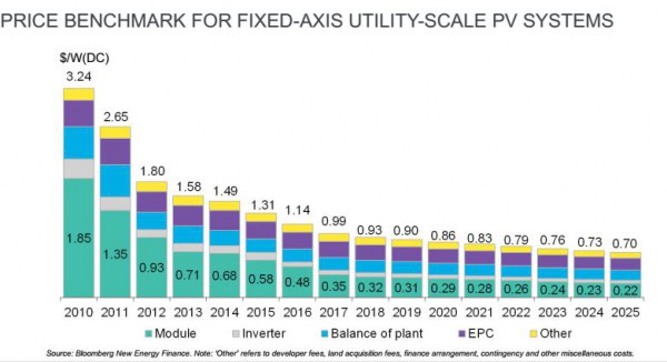 彭博的研究也顯示,2010年開(kāi)始,光伏組件成本每年都在下降,其他部分包括原材料和輔料的成本也在相應(yīng)減少。預(yù)計(jì)到2040年,光伏的全球度電成本將下降66%,全球新增光伏項(xiàng)目成本持續(xù)下降:組件價(jià)格較2016年下降30%。