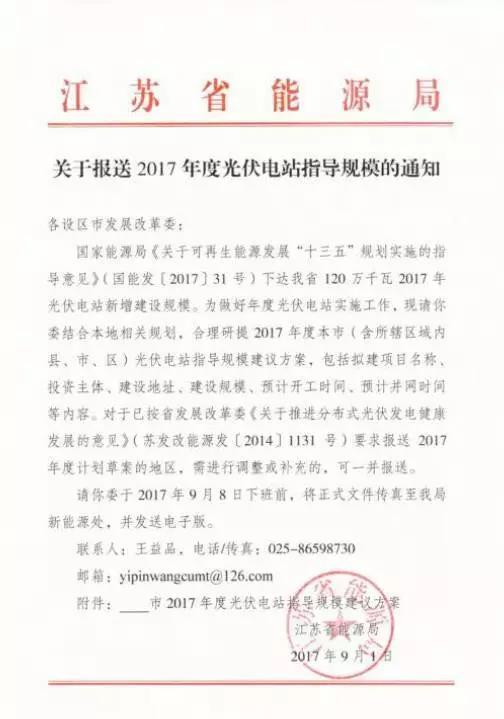 江蘇能源局要求9月8日前上報各地2017光伏指標方案 總規(guī)模120萬千瓦