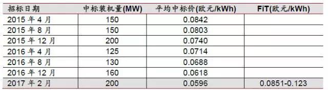 競(jìng)價(jià)上網(wǎng)制度為政府通過(guò)招標(biāo)的方式,確定最低中標(biāo)價(jià)為項(xiàng)目的上網(wǎng)電價(jià),且該電價(jià)保持若干年不變。德國(guó)2014年進(jìn)行大型地面光伏電站項(xiàng)目的招標(biāo)試點(diǎn),2015年開(kāi)始對(duì)100kw以上的項(xiàng)目實(shí)施招標(biāo)制,目前對(duì)規(guī)模在750kW-10MW之間的光伏項(xiàng)目實(shí)施競(jìng)價(jià)上網(wǎng)制度,從下表可以看出德國(guó)競(jìng)價(jià)上網(wǎng)中標(biāo)價(jià)比FiT的上限低接近60%,目前該上網(wǎng)電價(jià)已經(jīng)在德國(guó)煤電上網(wǎng)電價(jià)區(qū)間內(nèi)。