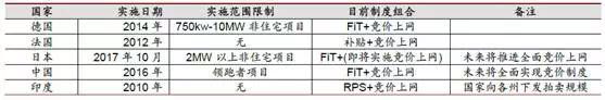 目前全球已經(jīng)有超過(guò)20個(gè)國(guó)家對(duì)光伏上網(wǎng)電價(jià)的確定實(shí)施競(jìng)價(jià)制度,光伏裝機(jī)大國(guó)已經(jīng)開(kāi)始或即將實(shí)施競(jìng)價(jià)政策。德國(guó)在2015年開(kāi)始對(duì)實(shí)施招標(biāo)制,我國(guó)2016年推出的領(lǐng)跑者計(jì)劃項(xiàng)目實(shí)施招標(biāo)制、未來(lái)該制度也將是趨勢(shì),日本也將在今年10月對(duì)2MW以上的大型光伏項(xiàng)目實(shí)時(shí)招標(biāo)制,主流國(guó)家的上網(wǎng)電價(jià)招標(biāo)制將是趨勢(shì),進(jìn)而推動(dòng)技術(shù)進(jìn)步與成本的進(jìn)一步降低。